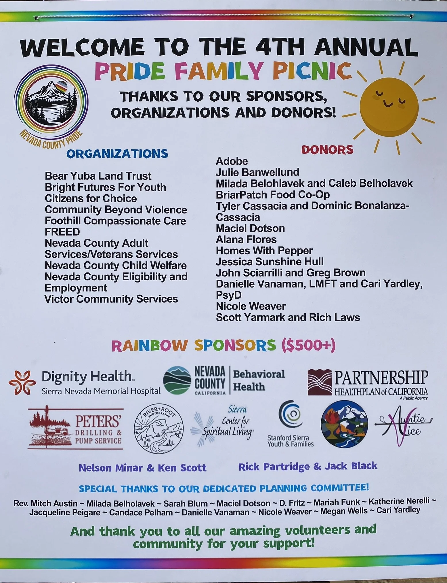 The 4th Annual Pride Picnic was a huge success, with around 500 people joining in what became our biggest celebration yet! From setting up tables to grilling hot dogs, leading games, performing music, and packing everything up in record time, every volunteer and vendor played a vital role in creating a joyful, welcoming space. Thanks to your incredible energy and support, our community came together to celebrate, connect, and feel truly seen.Special thanks to all our sponsors and donors who covered the costs of the picnic so we could make it free to the community (see poster below, and please thank these donors when you see them!)