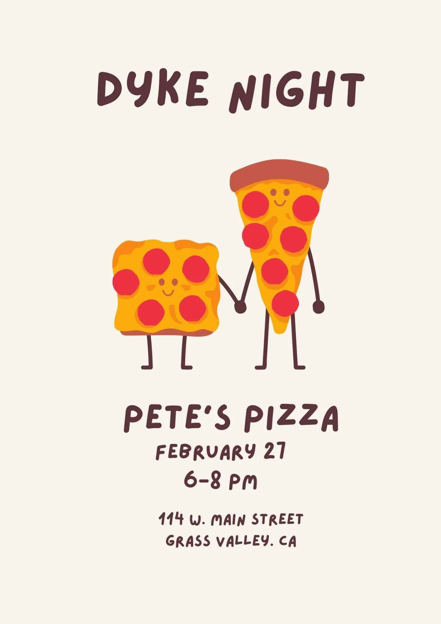 Dyke Night Tuesday, February 27, 2024 6:00 PM 8:00 PM Pete's Pizza 114 West Main Street Grass Valley, CA, 95945 United States (map) Google Calendar ICS