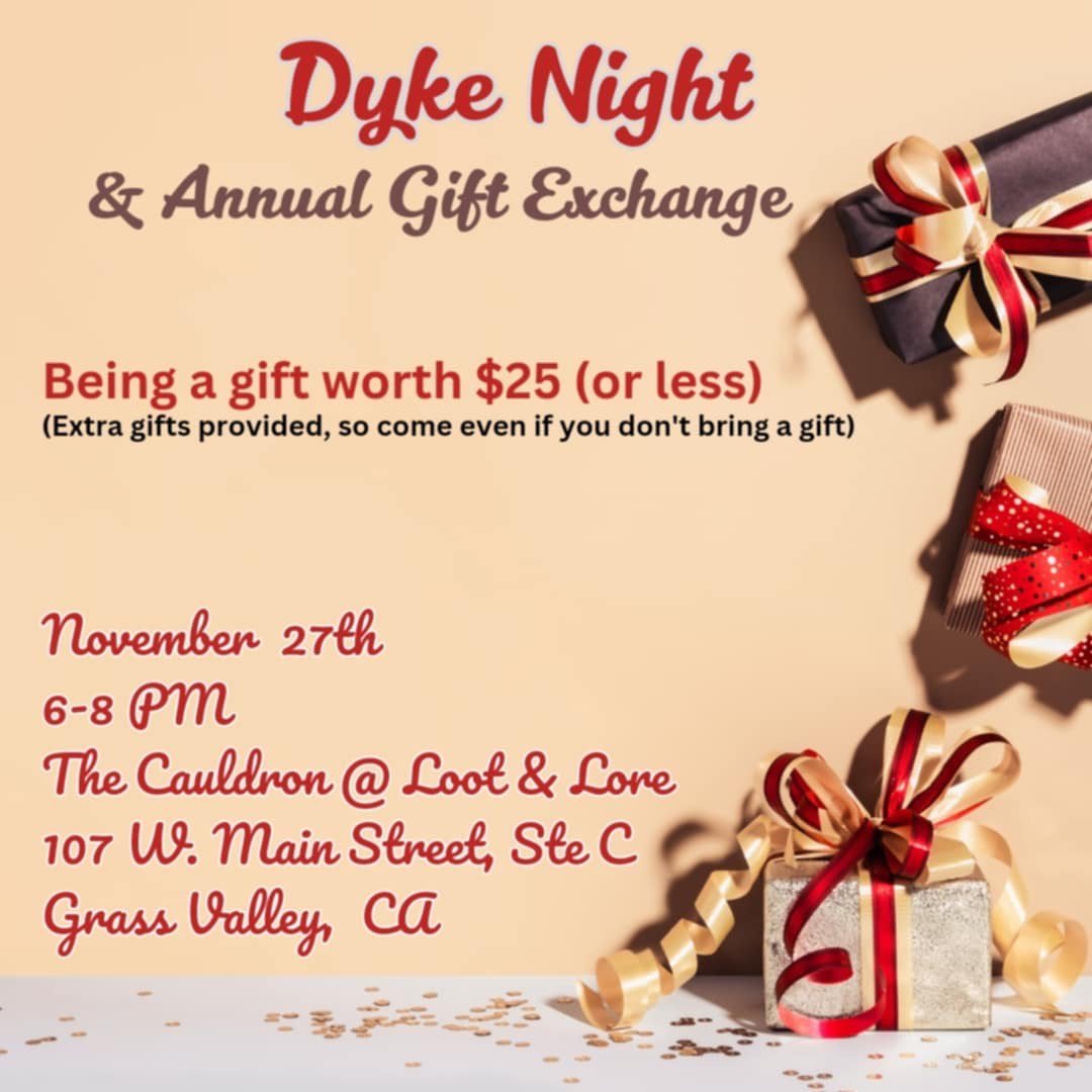 Dyke Night Wednesday, November 27, 2024 6:00 PM 8:00 PM The Cauldron @ Loot & Lore 107 West Main Street Ste A Grass Valley, CA, 95945 United States (map) Google Calendar ICS