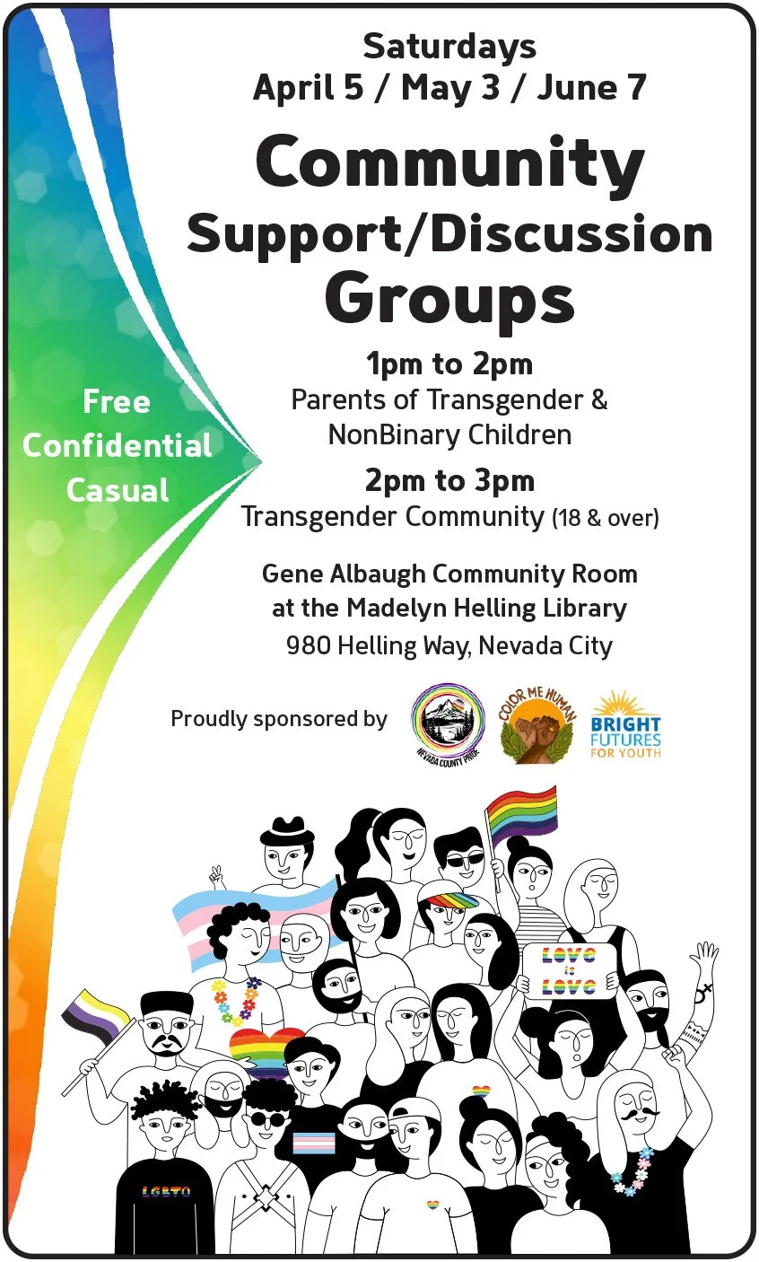 These groups are sponsored by Nevada County Pride with Color Me Human and Bright Futures for Youth. For questions or additional information, please email info@nevadacounty.pride.org .