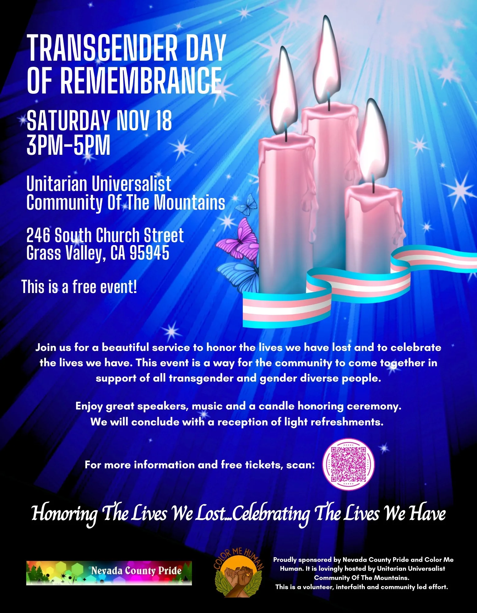 TDoR is a beautiful memorial service to remember and honor the lives of Transgender people killed due to violence. Please join our community on Saturday, November 18th, from 3 pm -5 pm at the Unitarian Universalist Community of the Mountains on 246 S. Church St., Grass Valley, CA. As we come together, honoring the lives we have lost and celebrating the lives we have, you will hear from amazing guest speakers, experience a video of lives lost, the opportunity to participate in a candlelight ceremony and conclude with an intimate reception of light refreshments.