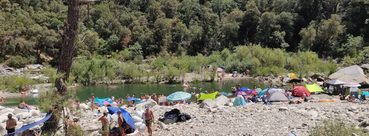 Dogs are allowed in California state parks as long as they are on a leash. Be aware though that the hike into Hoyt’s Crossing is about a mile and that there is very little shade at the beach, once there. The sand and rocks can be hot enough to burn paws and the river current can be strong and the rocks slippery. If you bring your dog, be prepared to keep your eye on them at all times, and clean up after them. Doggie bags are available from the River Ambassadors.
